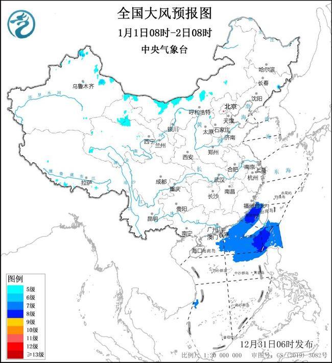 2024年1月1日08时至2024年1月2日08时,新疆北部、甘肃河西、内蒙古中西部、西藏南部、青海北部等地的部分地区将有5~6级、阵风7级的大风;台湾海峡、台湾以东瀛面、巴士海峡、南海东北部海域将有7~8级、阵风9级的大风。