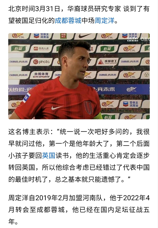 周定洋的祖父来自浙江,上世纪40年代末移居英国,到他这代照旧属于英格兰第三代华侨了,前几年他回台湾省省亲被球探发现从而归化当年,但因为那时他没招待主帅潜法例被贯穿穿小鞋,以“落伍未到”为由被台湾省队“破除征召”。周定洋一步错,步步错,而中国足协若是那时眼界更实验一些提前下手的话,也不会变成今天这种地步。