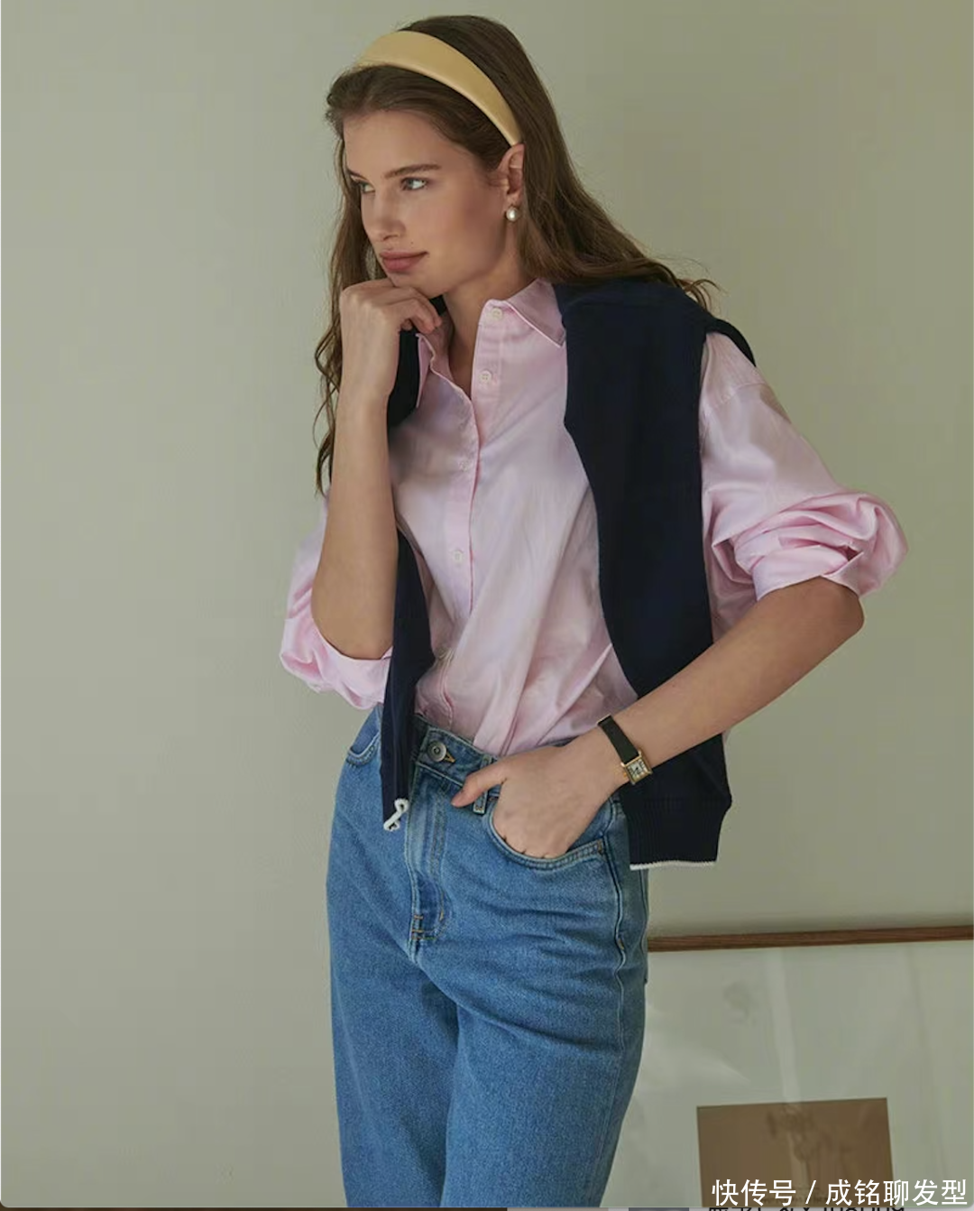 比如,常见的发箍与优雅长鬈发的组合就很养眼,除了领有心事性,也能在作风上加以变化。像这款优雅长鬈发搭配策画浅易的发箍,坐窝增添几分文艺气味,与衬衫+马甲+牛仔裤的组合,举座嗅觉速即纯真起来,既漂后洋气又有活力。